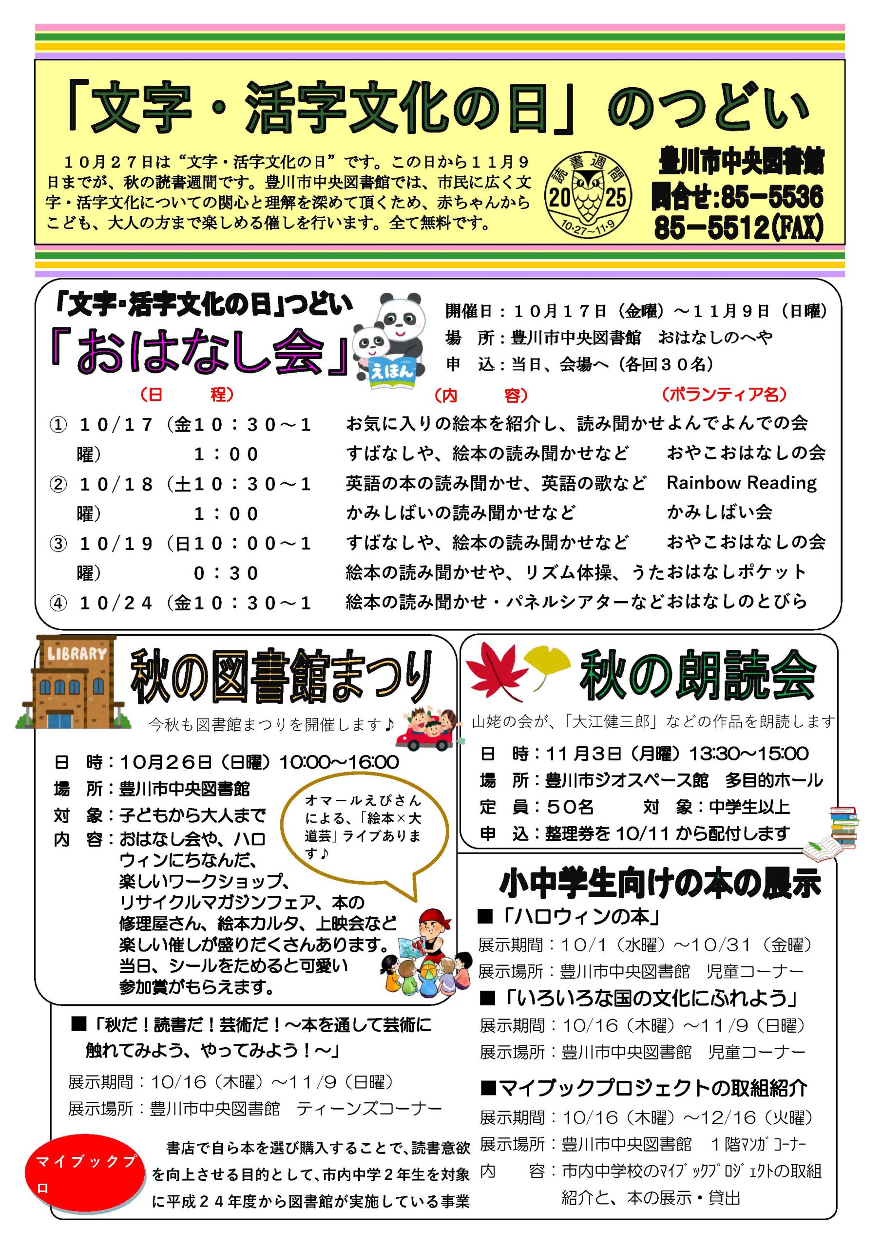 10月27日は、「文字・活字文化の日」です。この日から11月9日までが「秋の読書週間」です。中央図書館では、赤ちゃんから大人の方まで楽しんでいただける催しを行います。